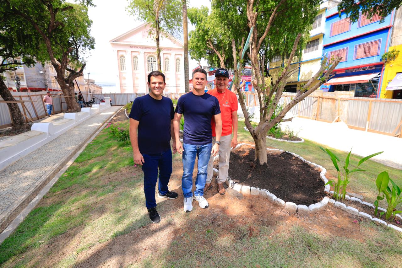 prefeito de Manaus, David Almeida, participou, na  sexta-feira, 10/10, de um ato simbólico de plantio de oliveiras na praça dos Remédios, no centro histórico da capital. A ação, realizada ao lado do vice-prefeito e titular da Secretaria Municipal de Infraestrutura (Seminf), Renato Junior, marca o avanço das obras de restauração completa do espaço centenário, que segue cercado por tapumes e em fase final de acabamento.