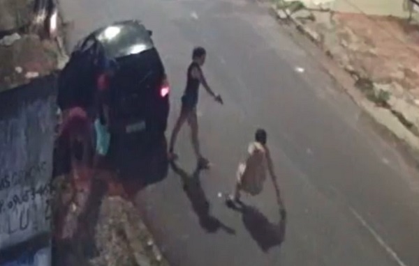 As imagens mostram o momento em que o homem é atingido com três disparos de arma de fogo pelo corpo, uma pedrada na cabeça e também golpes com uma barra de ferro.